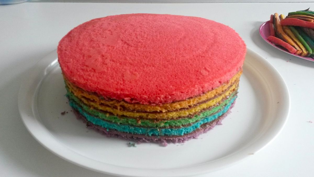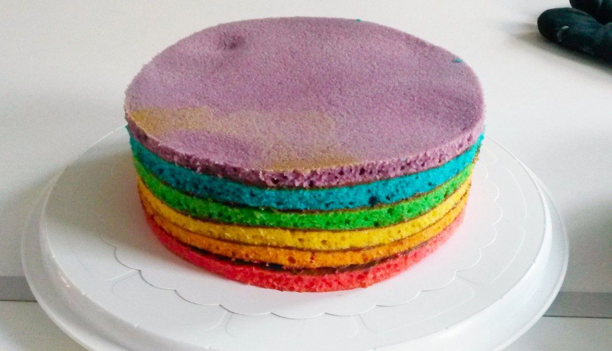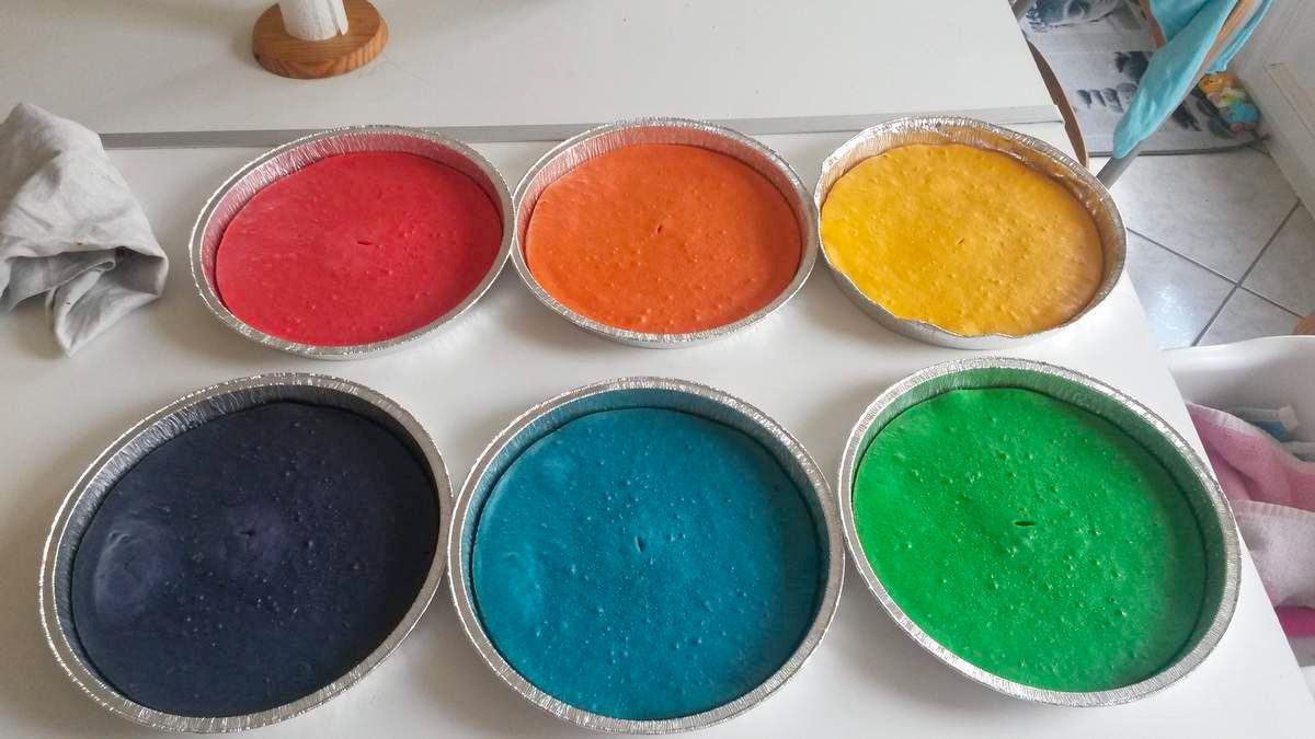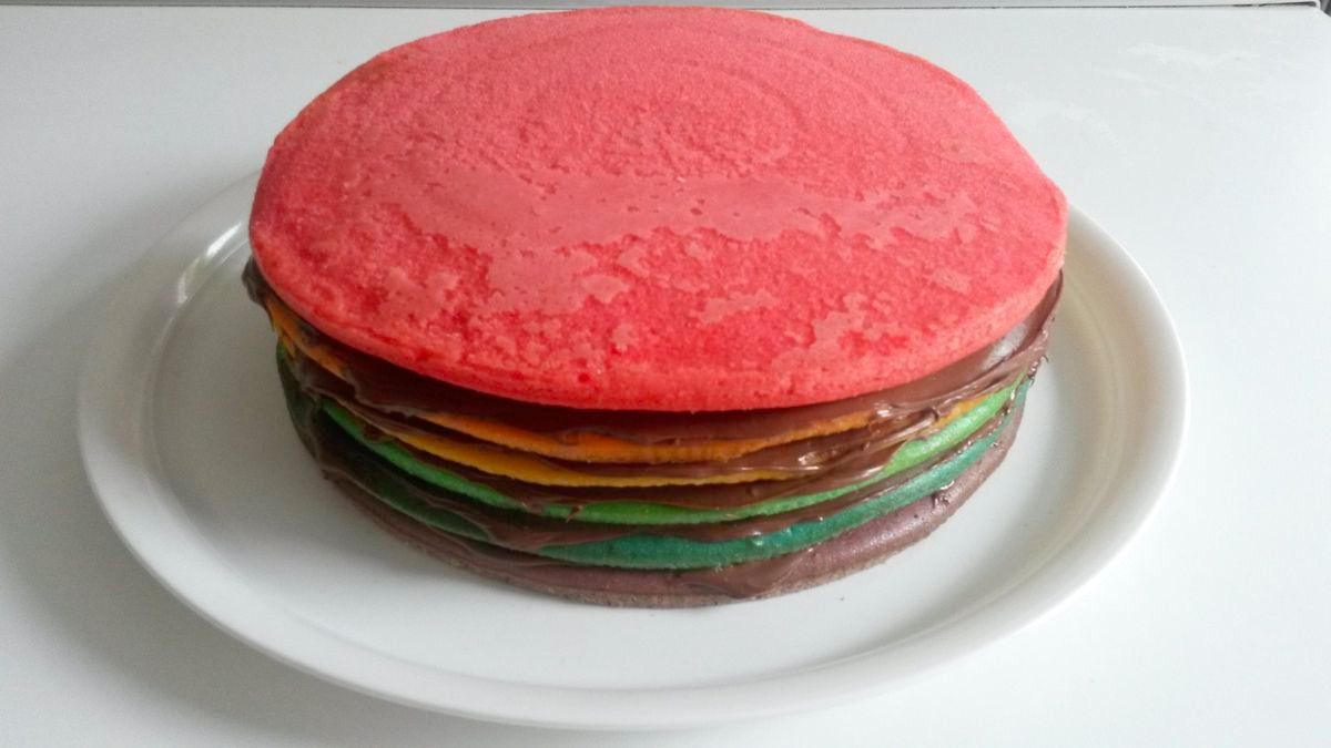 Commencer par la génoise violette, la recouvrir de nutella à l'aide d'une maryse, poser la génoise bleue, recouvrir de nutella et ainsi de suite avec les génoises vertes, jaune, orange et rouge (pas de nutella sur celle-ci). Je retourne souvent la dernière génoise, car quelques fois après la cuisson, le dessus est irrégulier et avec des bulles.