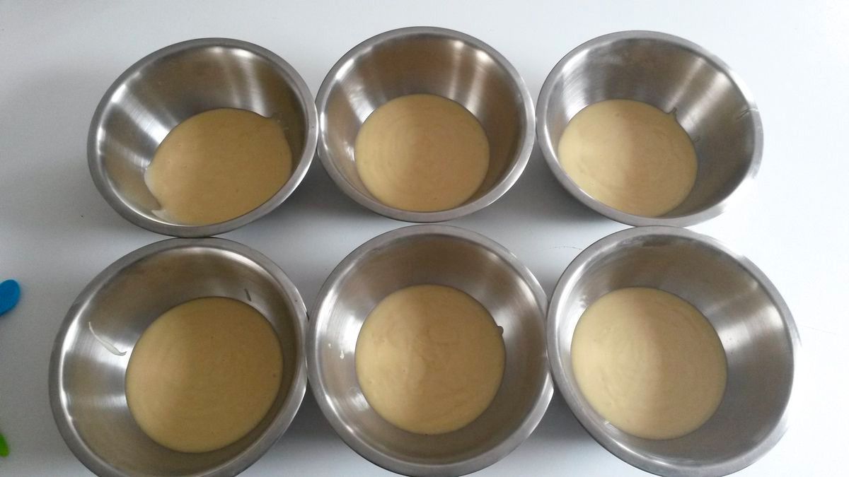 Répartir la pâte dans les 6 récipients en fonction du poids obtenu précédemment (ex : 250 gr). NB : avoir 6 récipients identiques n'est pas indispensable mais c'est vraiment très pratique.
