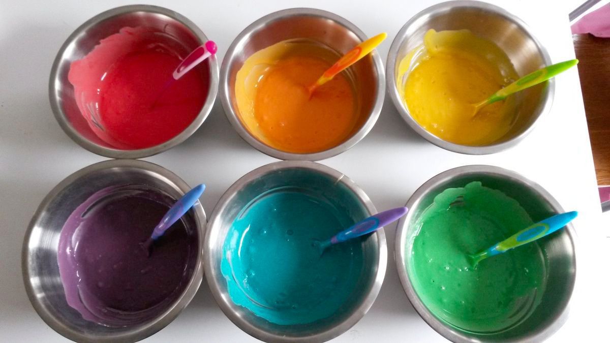 Incorporer les colorants en veillant à bien mélanger avec une cuillère pour uniformiser la couleur. Attention de ne pas mélanger trop longtemps car vous risquez une mauvaise surprise à la cuisson (effet flan pas cuit). Si la couleur n'est pas assez prononcée, ajouter du colorant par petite touche avec un cure-dent.