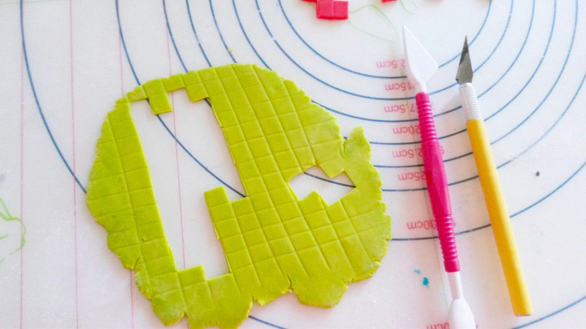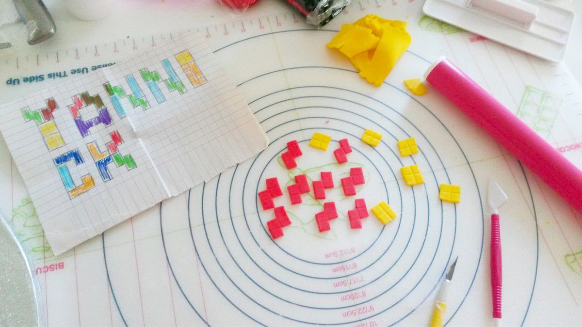Petite astuce déco : Pour les motifs "Tétris", j'ai quadrillé de la pâte à sucre et ensuite, j'ai découpé selon les formes du jeu.