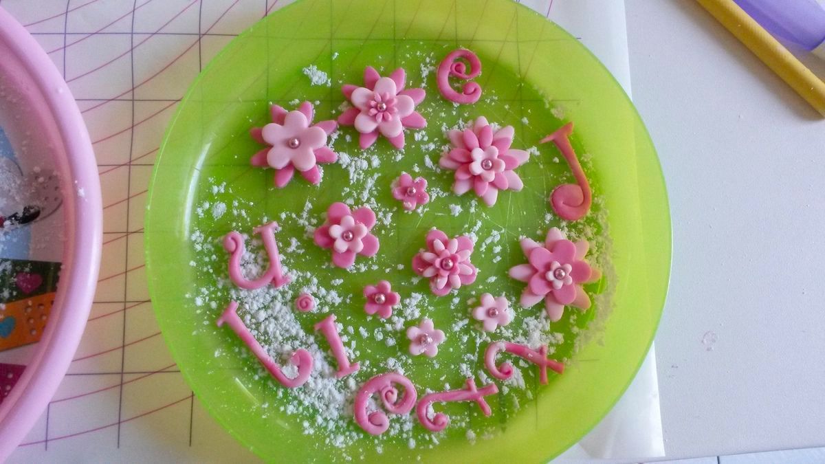 Pour finir, j'ai parsemé la plupart des éléments en pâte à sucre de paillettes roses comestibles.