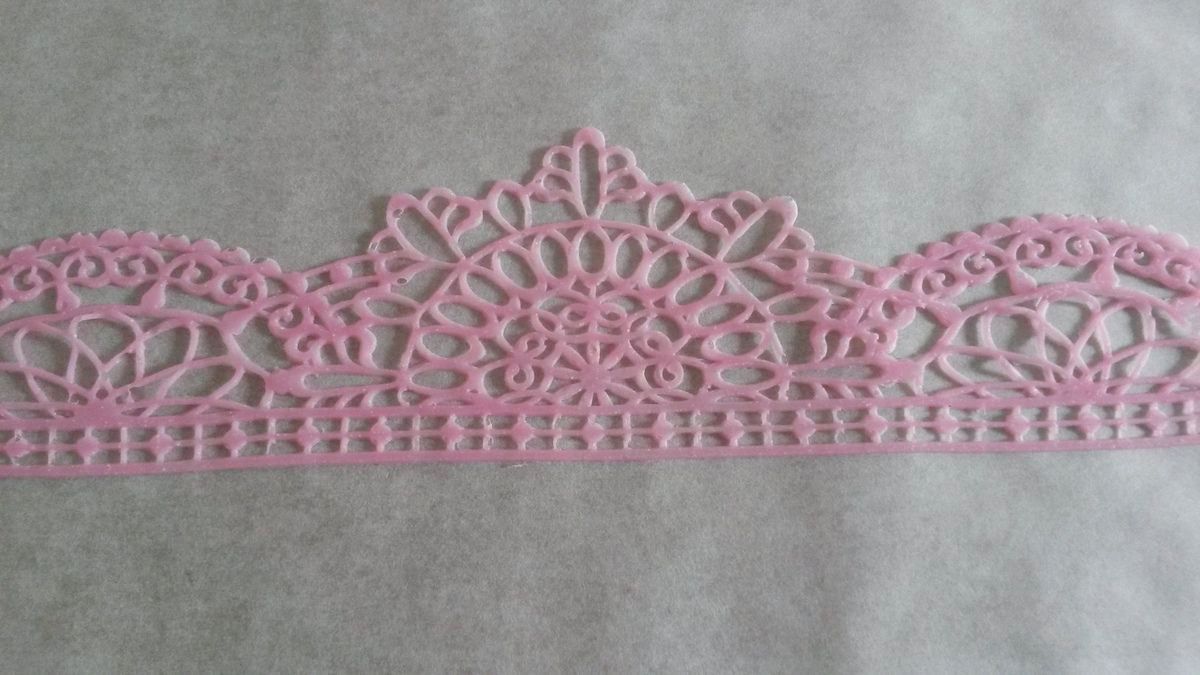 J'ai recouvert le gâteau de pâte à sucre blanche, puis j'ai apposé la frise en sucre dentelle que j'ai collée à l'aide du pinceau à réservoir.