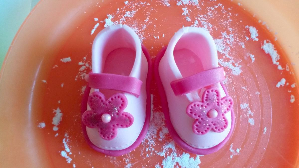 La veille, j'ai préparé les éléments principaux - la frise en sucre dentelle, les fleurs, le prénom et les chaussons de bébé - car la préparation de certains nécessitait pas mal de temps. Les petits chaussons n'ont pas été simples à réaliser mais je me suis appuyée sur le tuto suivant : tuto chaussons bébé