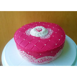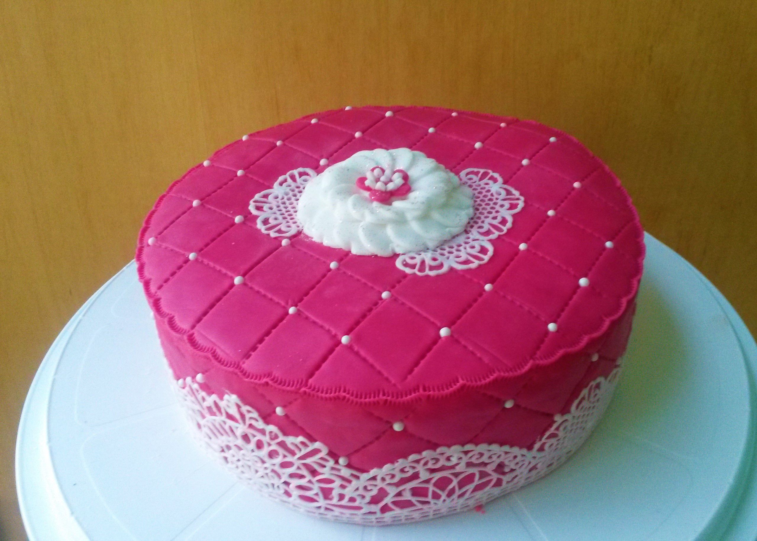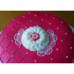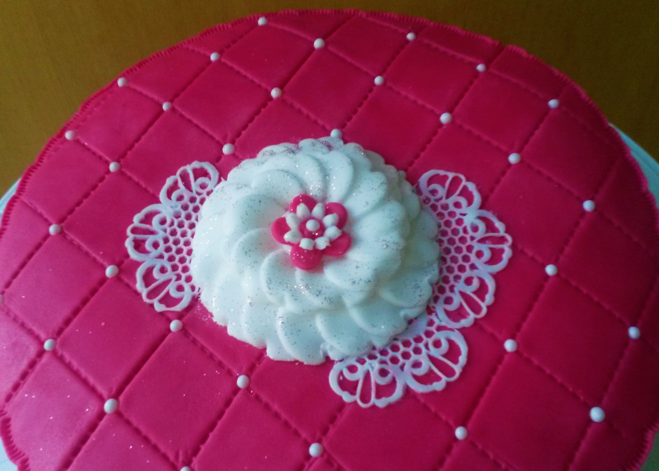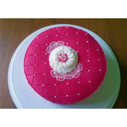 Une fois la pâte à sucre fuchsia posée sur le gâteau, j'ai réalisé l'effet capitonné avec un embosseur à carreaux. Cette étape est à effectuer avant que le pâte à sucre ne sèche en appliquant l'embosseur légèrement pour obtenir un pré-tracé sur toute la surface du gâteau.