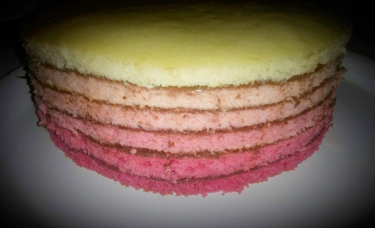 J'ai utilisé la recette du rainbow cake sauf qu'à la place des couleurs de l'arc en ciel, j'ai réalisé un dégradé de rose en ne colorant pas une génoise et en colorant les cinq autres progressivement jusqu'à un rose très soutenu. Pour info, il s'agit d'un gâteau surprise aux smarties.