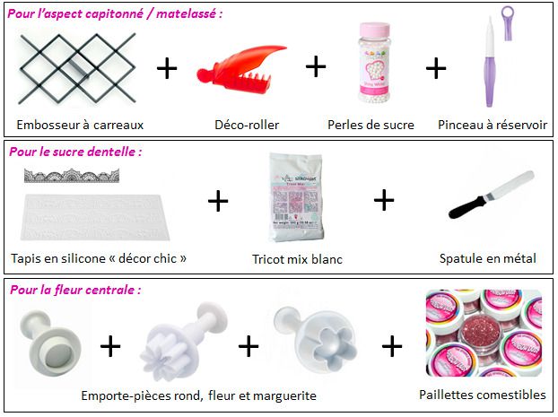 Pour la déco extérieure, voici les outils dont j'ai eu besoin en plus du matériel de base pour le travail de la pâte à sucre :
