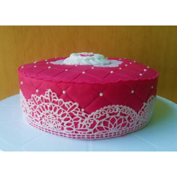 A savoir : le début et la fin sur le pourtour tombent rarement pile poil au niveau du raccord. Prévoyez donc que cette partie "raccord" se retrouve soit derrière soit camouflée avec un autre motif en pâte à sucre. Pour mon gâteau, le sucre dentelle m'a permis de bien cacher la liaison.