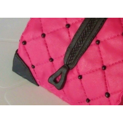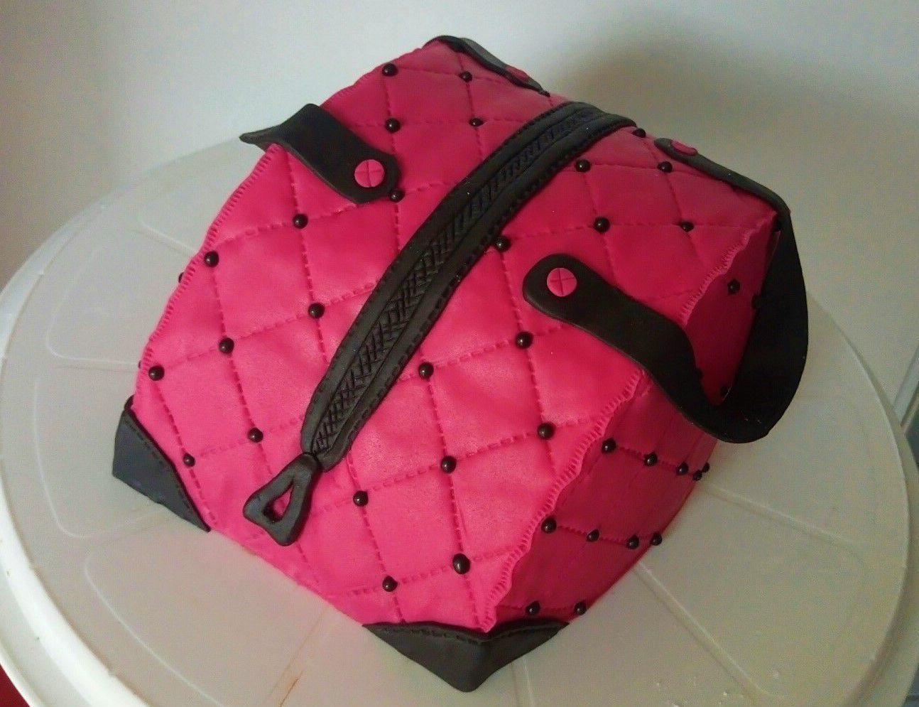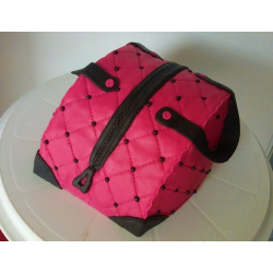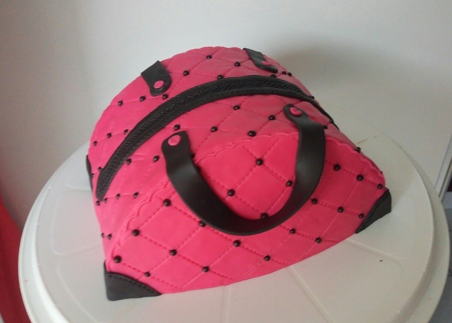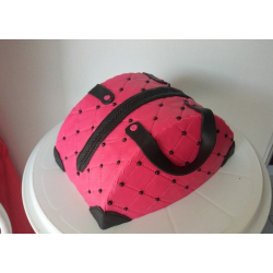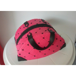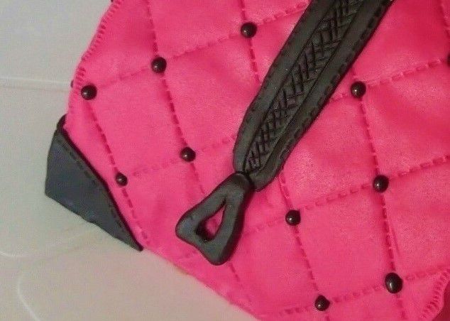 Ensuite, il ne reste plus qu'à laisser libre cours à son imagination pour personnaliser le sac. Pour ma part, j'ai souhaité jouer la sécurité en réalisant un effet capitonné (j'ai l'habitude de faire ce motif) sur de la pâte à sucre rose fuchsia avec de petites perles de sucre noires.