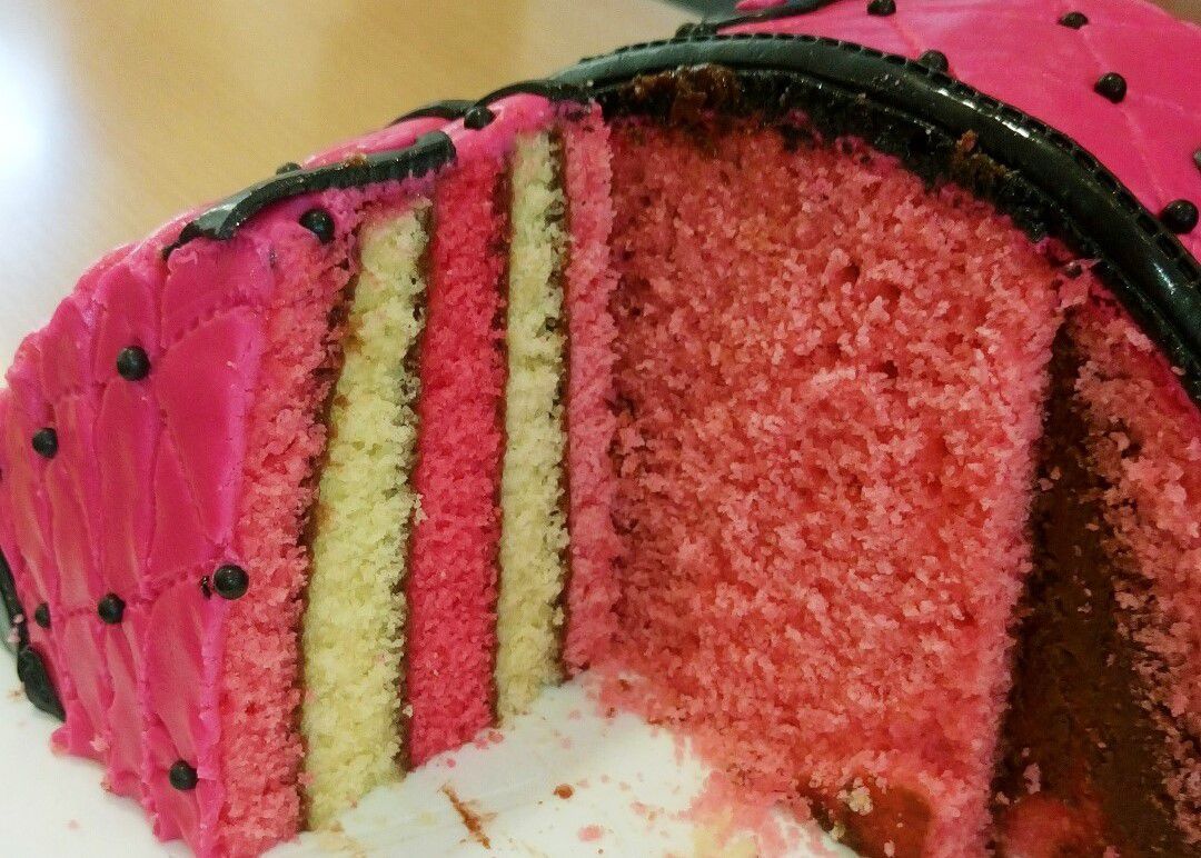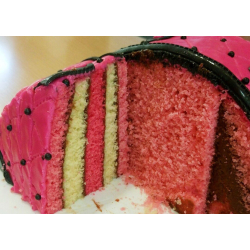 J'avoue, je me suis un peu compliquée la vie parce que j'ai réalisé un rainbow cake bicolore, rose et blanc, donc je flippais qu'en retournant l'ensemble sur la tranche, les différentes couches de génoises se désassemblent. Au final, aucun problème de ce côté-là.