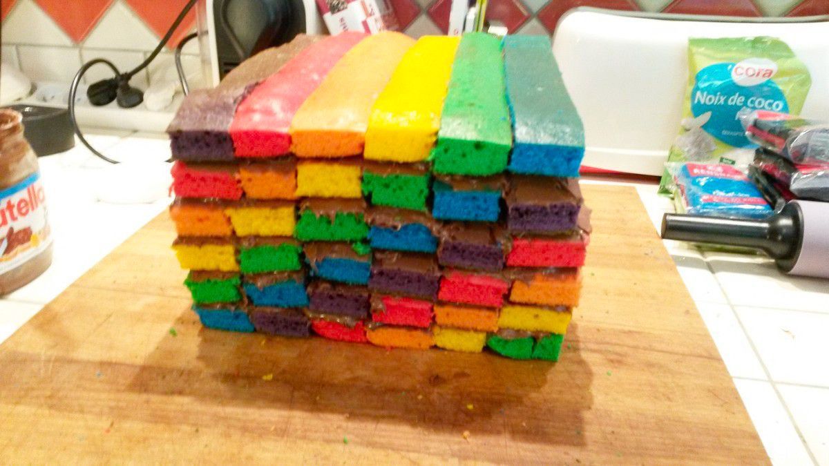 Par la suite, je me suis servie de la recette des génoises du rainbow cake car les textures et la tenue des pâtes cuites étaient parfaites pour le montage du damier.