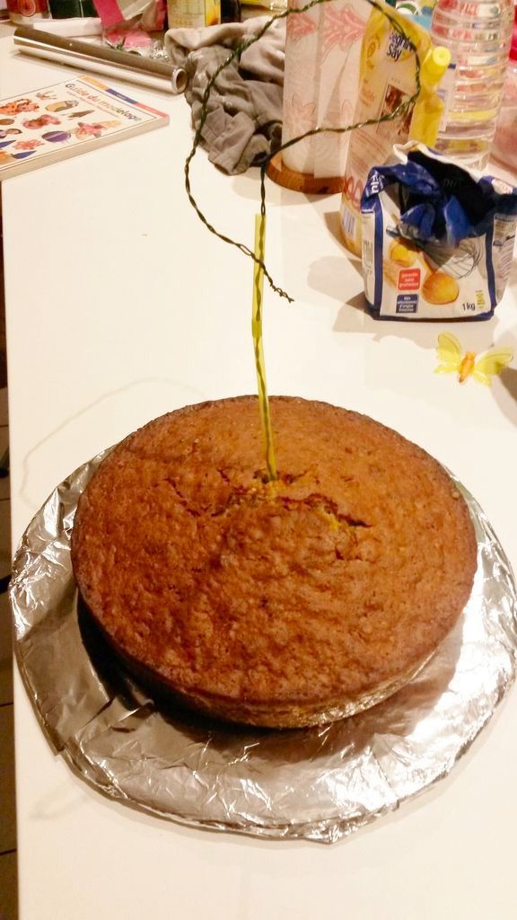 Maintenant, l'étape délicate : poser le gâteau sur le plat en faisant passer le fil de fer à travers. Si vous le pouvez, effectuez cet étape à deux, sinon le gâteau risque de se déchirer.