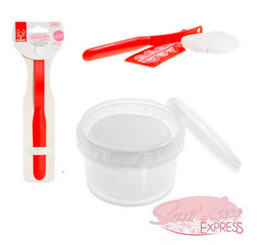 Pour mon premier essai, j'ai testé le kit de la marque Sweet Lace, comprenant une pâte prête à l'emploi, une spatule en plastique et un tapis en silicone.