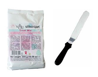 Cependant, je ne me suis pas avouée vaincue et j'ai à nouveau tenté de réaliser du sucre dentelle. Cette fois-ci, j'ai choisi la poudre à diluer ou "Tricot mix" de la marque Silikomart et j'ai acheté une spatule (ou raclette) en métal. Et là, quelle facilité d'application !