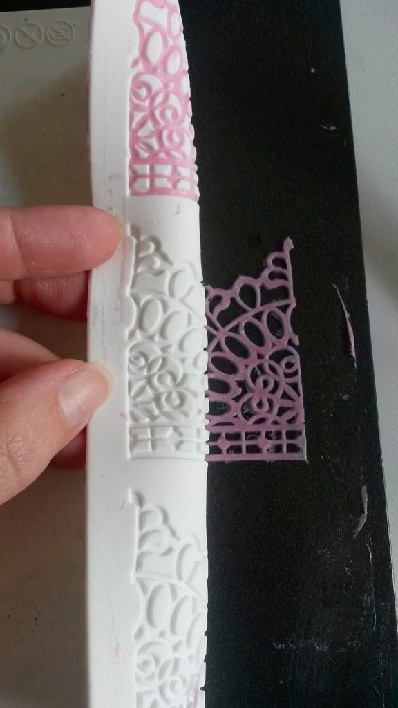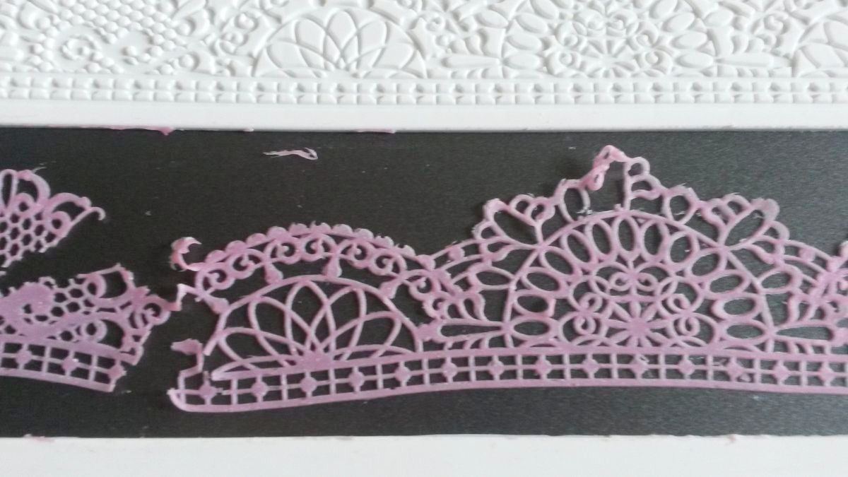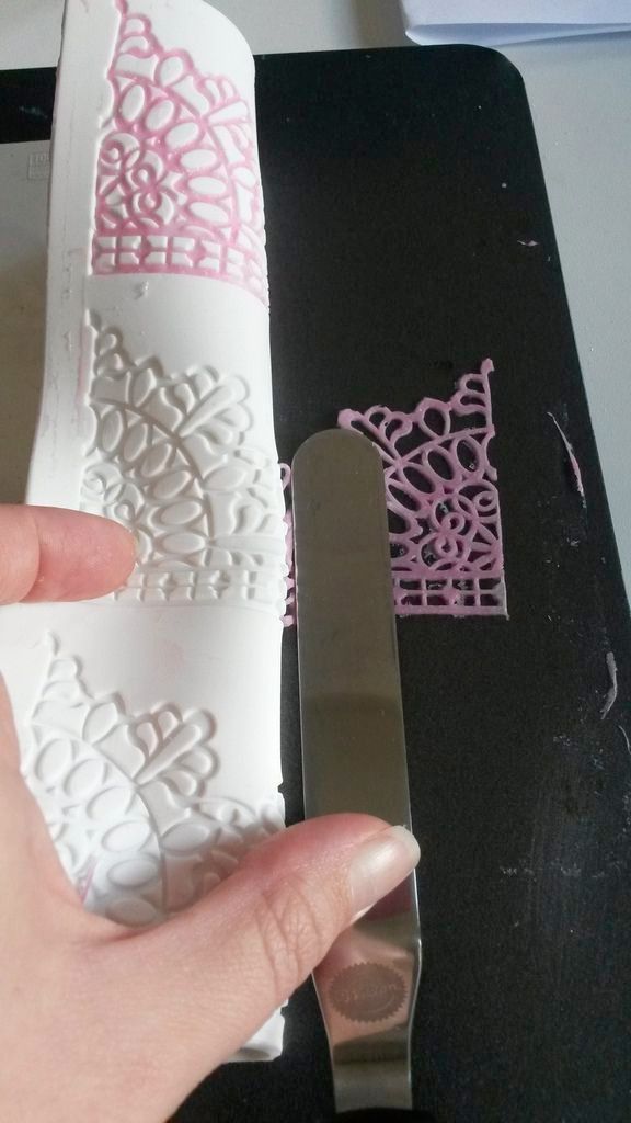 Par contre, pour les motifs tels que les frises, il faut procéder encore plus méticuleusement. Voici ma "technique" : je retourne le tapis et à l'aide de la spatule en métal, je décolle petit à petit le sucre dentelle. Le fait de retourner le tapis permet de ne pas déformer le sucre dentelle et de manipuler le tapis de sorte que la dentelle ne se déchire pas.