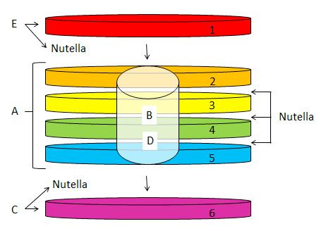 Etape A une fois toutes les génoises cuites et refroidies, assembler les quatre centrales (N°5, 4, 3 et 2) en étalant du nutella entre chaque (entre bleu et vert, entre vert et jaune, et entre jaune et orange).